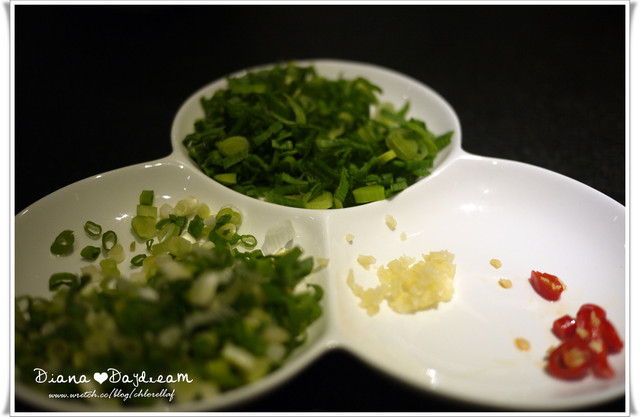 蔥花、蒜末、辣椒放在這盤子裡感覺好高級,一桌一盤,不夠可再加